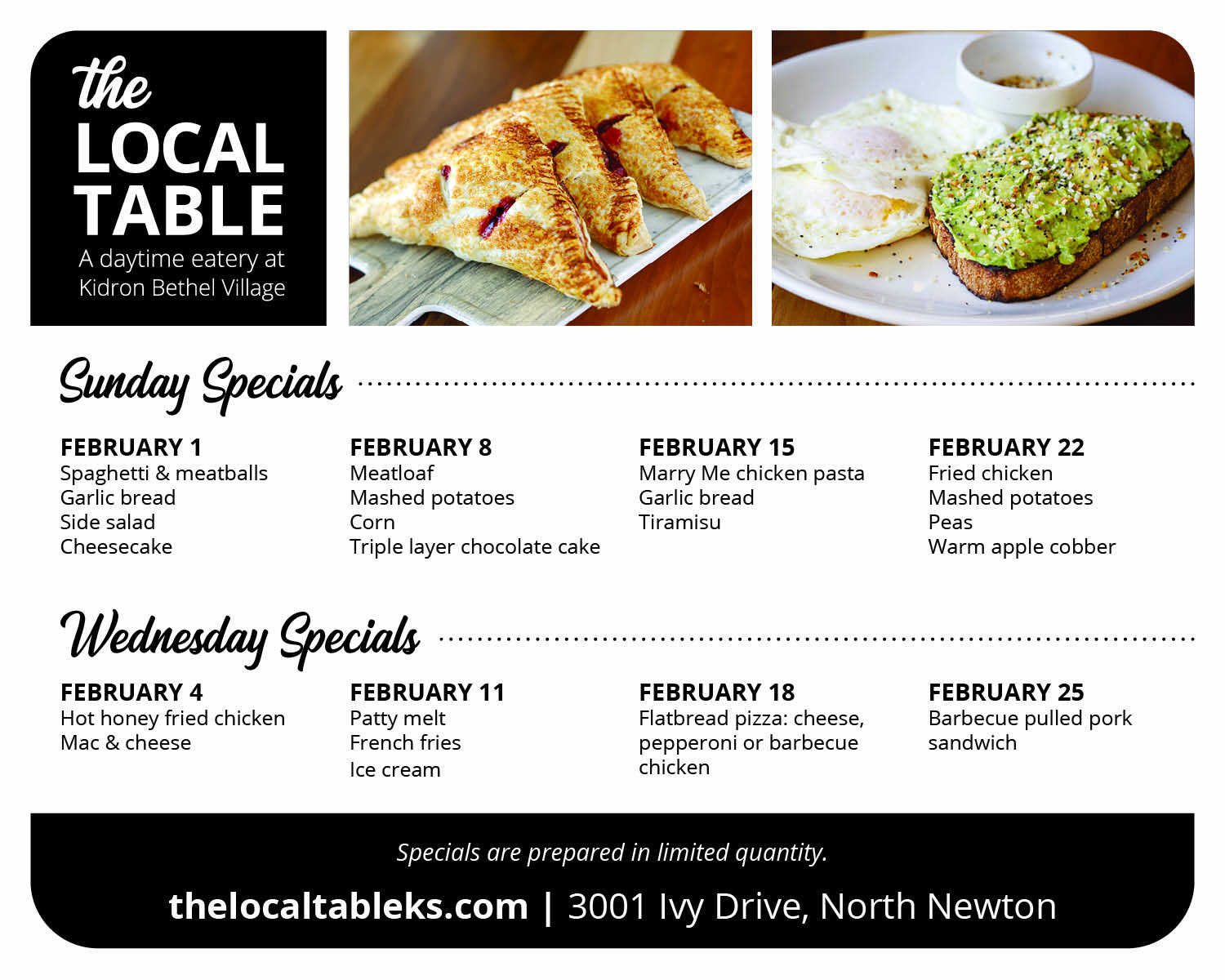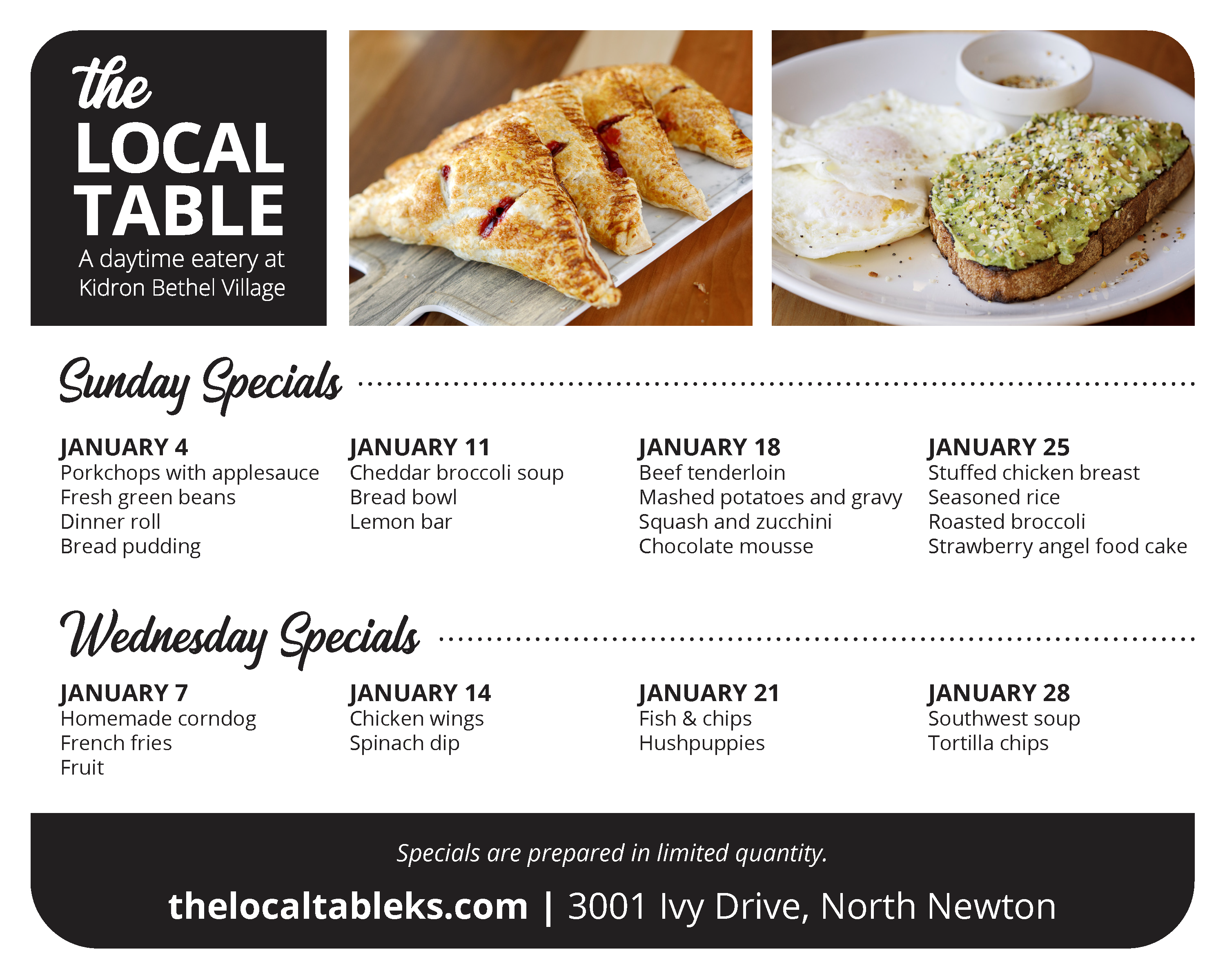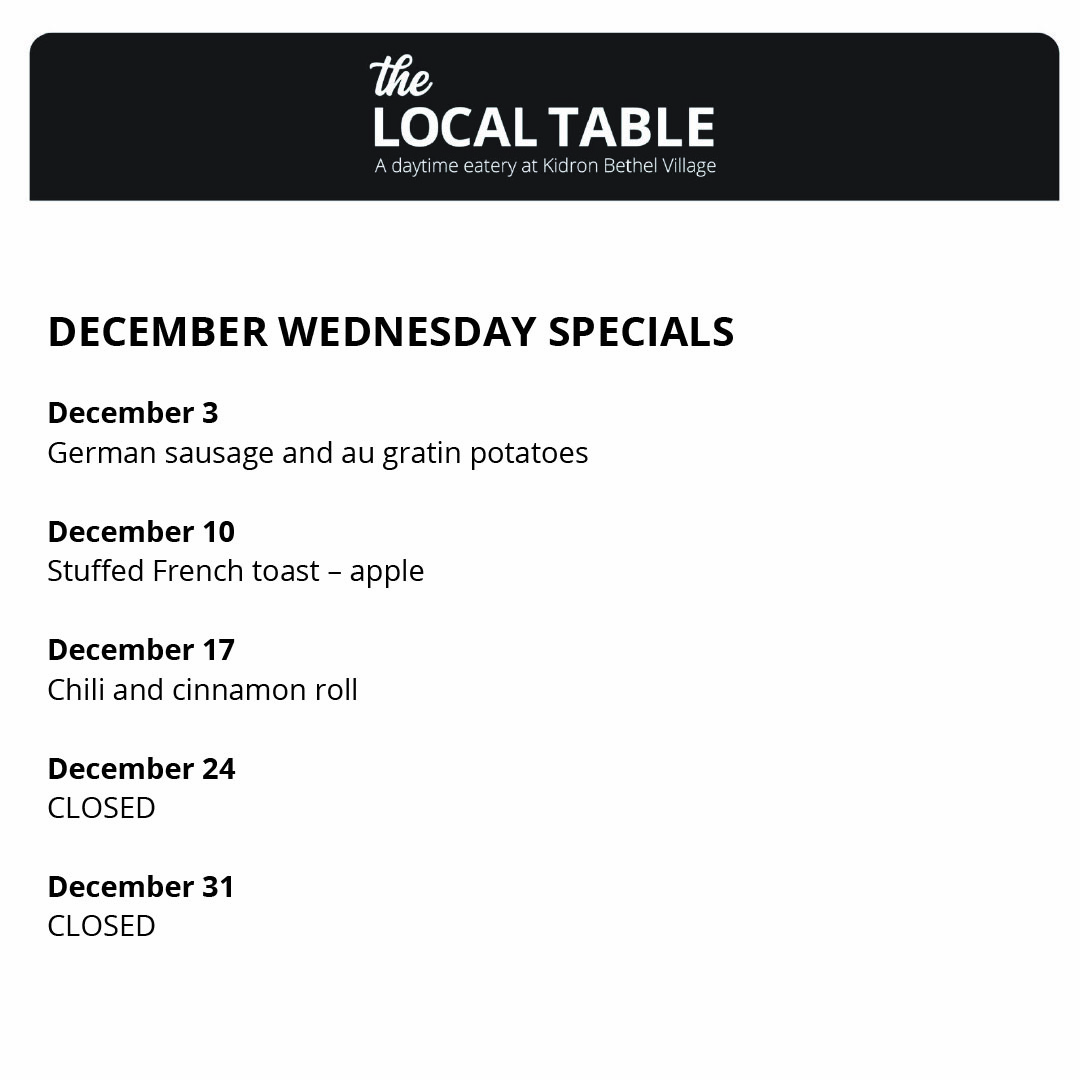 3001 Ivy Drive, North Newton, KS: From the North Newton exit off I-135, south .3 miles to 30th St, right (west) onto 30th Street .1 miles, continue onto Ivy Drive .1 miles. The Local Table is located inside the Kidron Bethel Village Welcome Center. If you have questions, please call 316-836-4850.